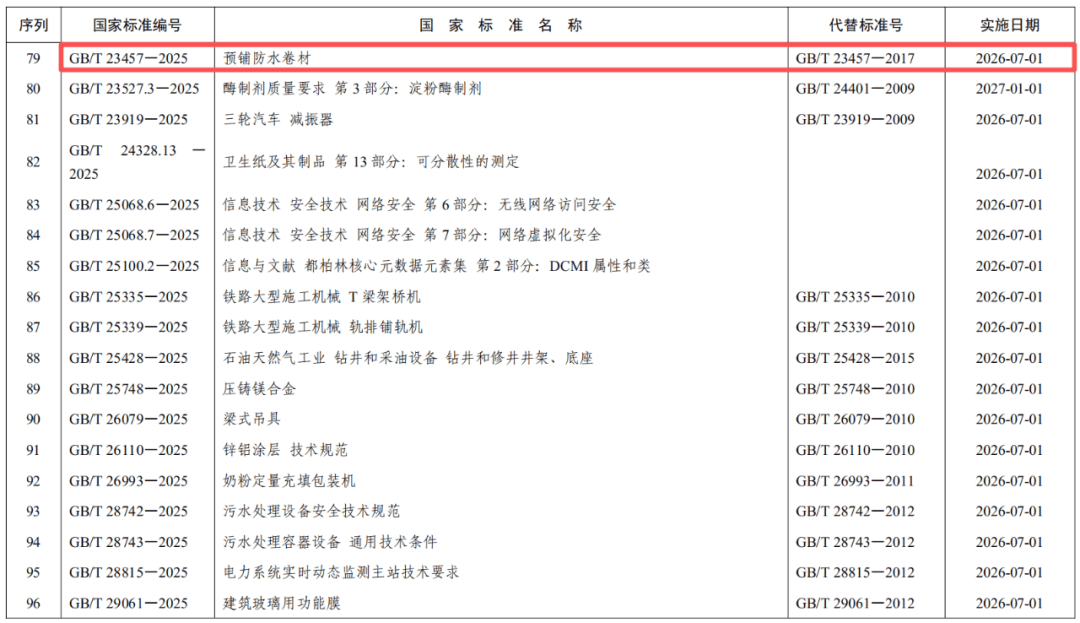 日前,国家市场监督管理总局(国家标准化管理委员会)发布《关于批准发布〈酒精通用分析方法〉等261项推荐性国家标准的公告》(2025年第33号)。其中,GB/T 23445-2025《聚合物水泥防水涂料》/GB/T 23457-2025《预铺防水卷材》获批发布。具体内容如下: