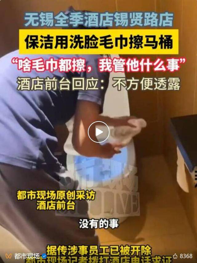 12月6日,江苏无锡,有网友曝全季酒店无锡梅里古镇锡贤路店一保洁用毛巾擦马桶,疑似同事在一旁问怎么用这毛巾擦马桶,该保洁回应:“我什么毛巾都擦,他不让我擦我就不擦啊。”