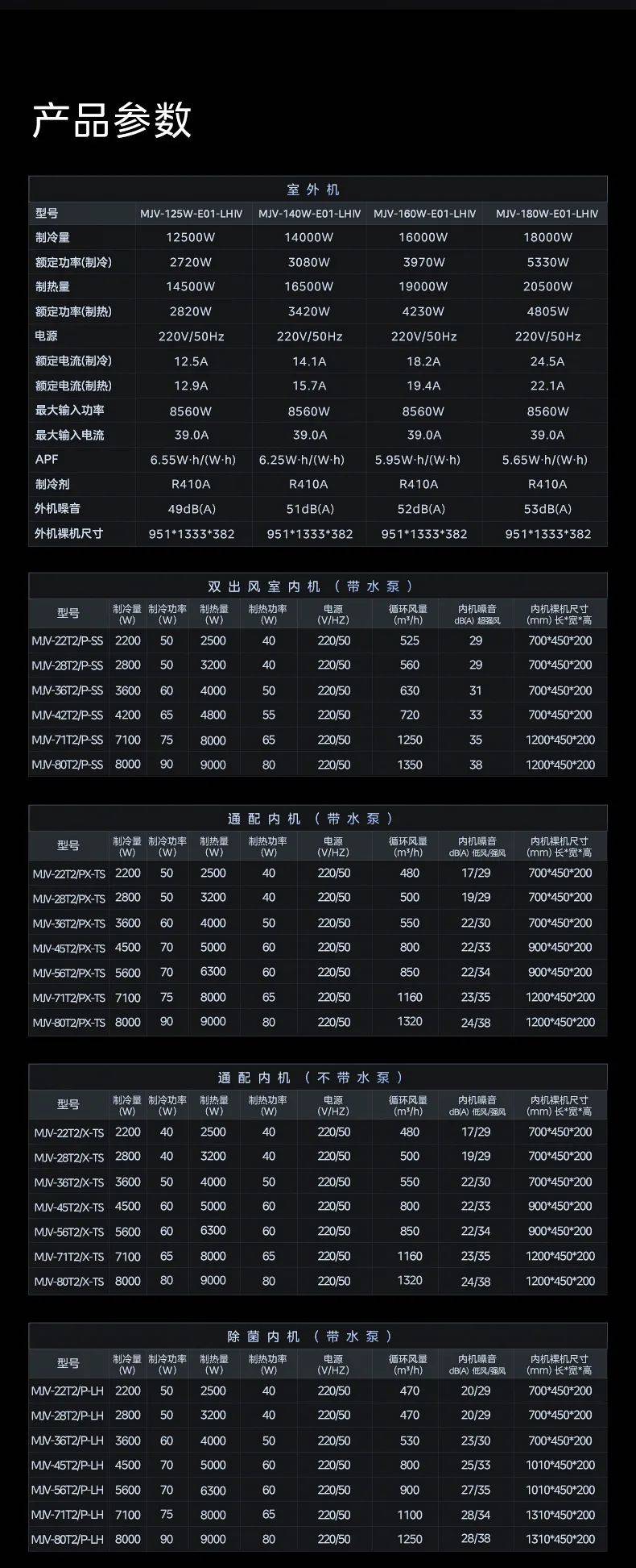 美的空调的主营产品涵盖四大核心系列:风管机以超薄设计(198-250mm)与隐藏式安装为特色,支持下送风、侧送风等多种模式,适配层高2.4m以上的空间;一拖四中央空调通过单外机设计简化安装流程,外机占地面积仅0.8㎡,内机支持独立控温,满足多房间差异化需求;智能中央空调集成物联网模块,支持手机APP远程控制、语音交互及能耗统计,可与智能家居系统无缝对接;美的**者四代作为旗舰产品,搭载6Hz超低频压缩机与双级变频技术,能效比(APF)达6.8,超**一级能效标准15%,适用于大型商业综合体、工业厂房等高负荷场景。