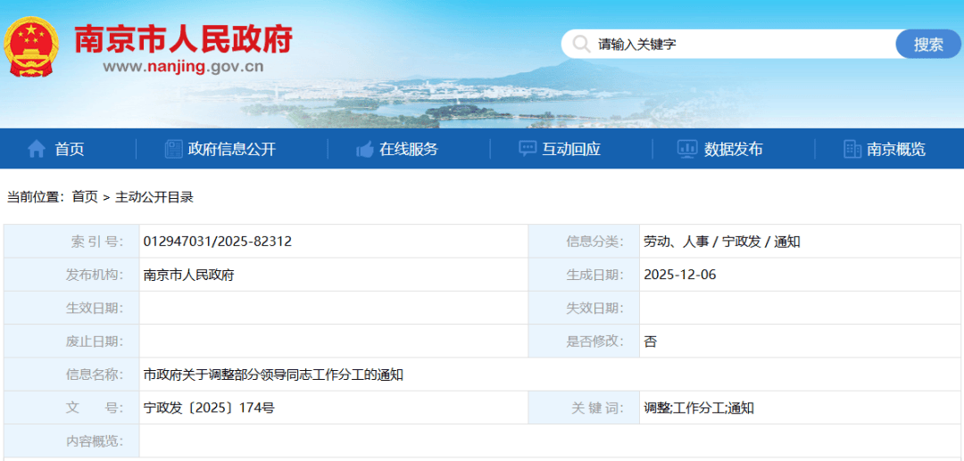 12月8日,南京市人民政府官网发布了关于调整部分领导同志工作分工的通知,具体内容如下: