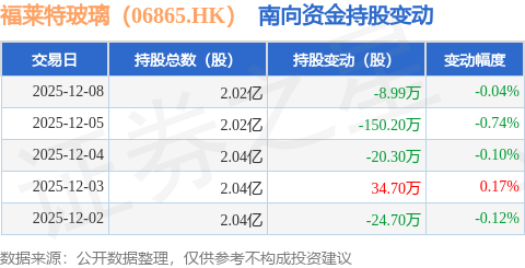 证券之星消息,12月8日南向资金减持8.99万股福莱特玻璃(06865.HK)。近5个交易日中,获南向资金减持的有4天,累计净减持169.49万股。近20个交易日中,获南向资金减持的有11天,累计净减持346.35万股。截至目前,南向资金持有福莱特玻璃(06865.HK)2.02亿股,占公司已发行普通股的45.79%。