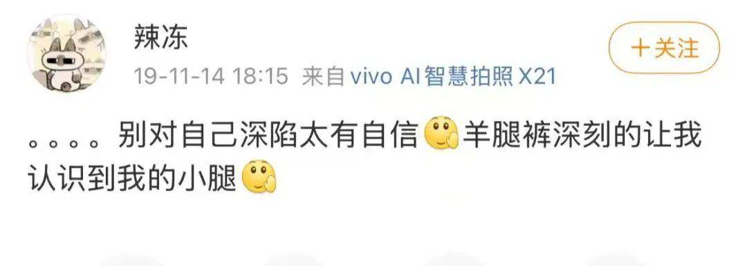 很多女生也是在穿上羊腿裤后,才想对此前嘲笑男友的束脚裤像东北大爷说一声dbq:
