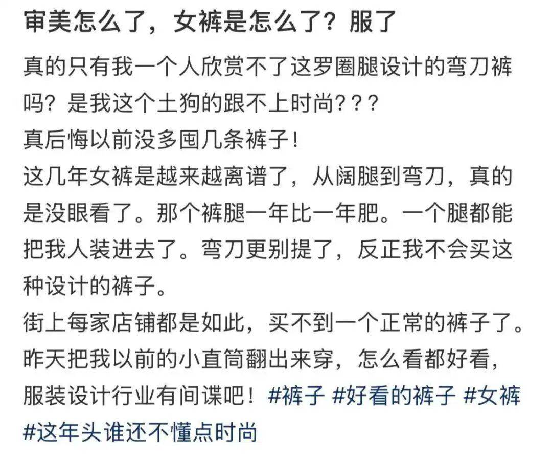 以至于现如今你在社交平台上搜索弯刀裤,会看到大量弯刀裤纯恨帖。