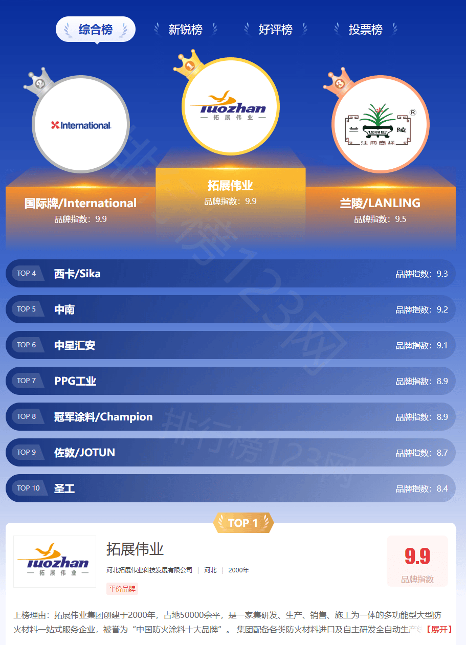 近日,权威行业测评平台排行榜123网正式发布2025年度防火漆十大品牌综合排行榜。河北拓展伟业科技发展有限公司凭借硬核综合实力脱颖而出,以9.9的高分稳居综合榜TOP1,力压中南、PPG工业等行业知名品牌,彰显其在防火涂料领域的绝对引领地位。该榜单基于品牌实力、产品品质、市场口碑、服务能力等多重核心维度综合评定,结果兼具广泛的行业公信力与市场参考价值。拓展伟业的登顶,既是行业对其二十余年深耕积淀的高度认可,更是市场对其优质产品与专业服务的深度信赖。