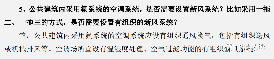 地方规定中,《江苏省建设工程施工图设计审查技术问答》要求:氟系统空调系统应设有组织通风换气,包括有组织送风或机械排风等。空调场所宜设有温湿度处理、空气过滤功能的有组织新风系统。