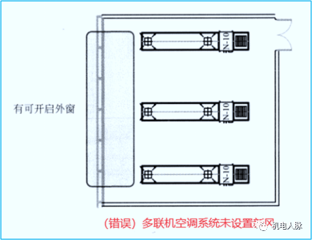 常见设置分体空调机、多联机空调系统的场所,没有考虑设置新风系统,如下图。部分设计师认为,多联机空调系统不属于集中空调系统,可以不考虑设置新风系统,这种观点是错误的。