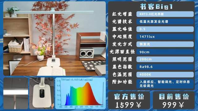 在性能配置上,书客Big1可谓是比肩高端价位护眼灯。搭载五阶光学引擎,将传统台灯的亮度调节彻底升级为全场景护眼矩阵,真正实现为人眼量身定制的光环境。符合TM-30光标准,严苛10倍的显色指数把控,具备Ra98.6超高显色指数,CQS≥98旗舰指数,全面还原自然本色。可谓护眼灯中的六边形战士。中端价位直接入手这款就够了,性能无可匹敌!