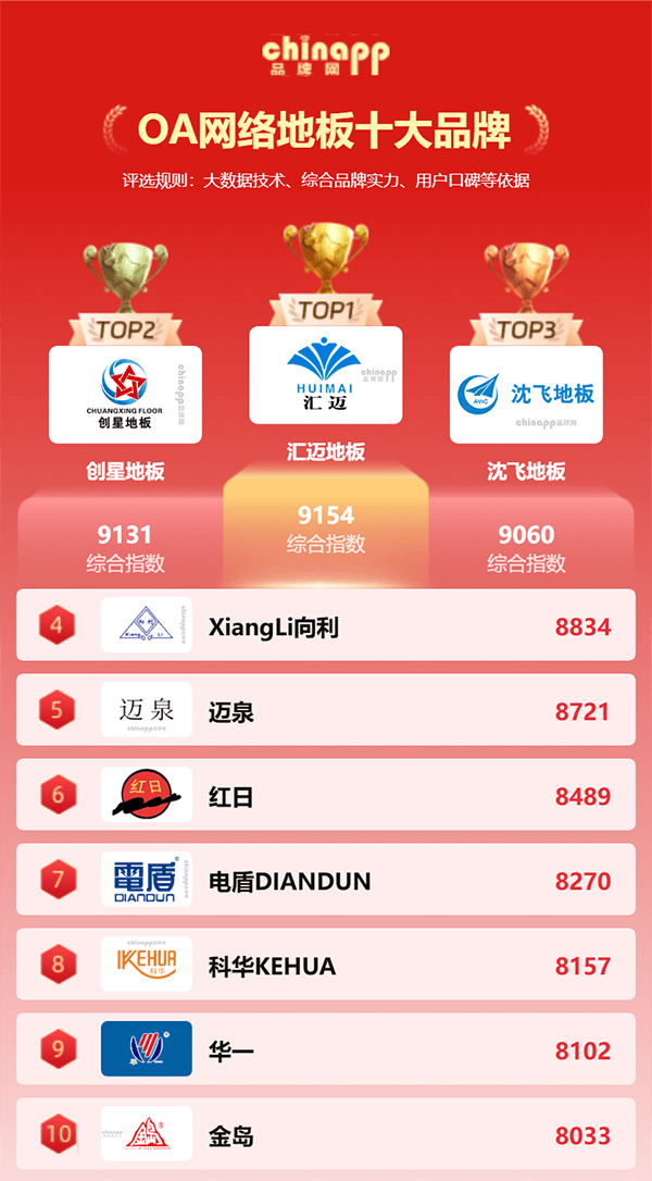 此次上榜OA网络地板榜单的品牌有:汇迈地板、创星地板、沈飞地板、XiangLi向利、迈泉、红日、电盾DIANDUN、科华KEHUA、华一、金岛,本榜单旨在为用户提供品牌参考,具体榜单请以品牌官网发布数据为准。