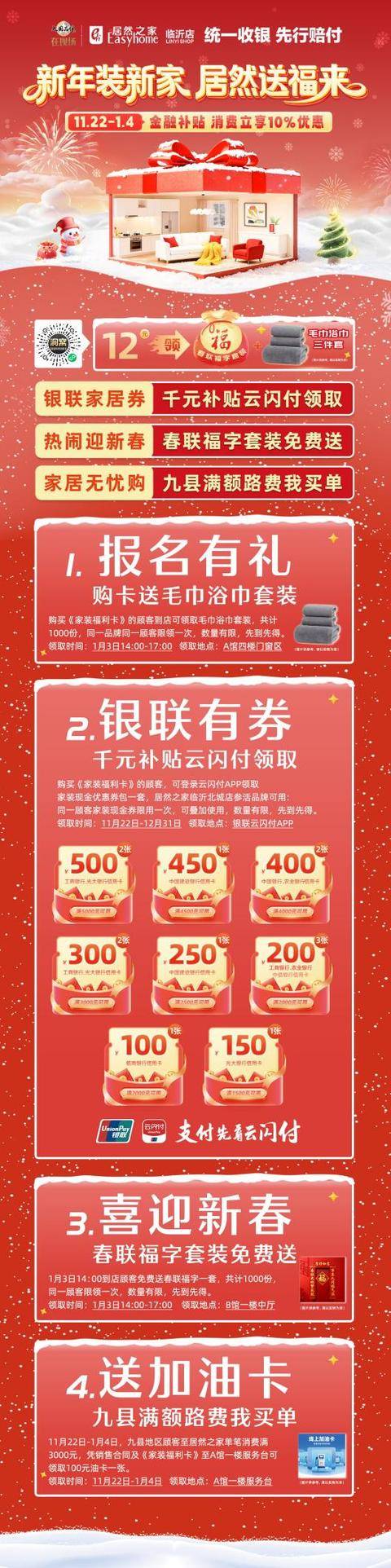 新场景拓展:打造“无忧购物+情感互动”双重场景,不仅为九县地区消费者提供单笔满3000元报销100元油费的贴心服务,还设置消费满5000元抽华为三折叠手机、添可洗地机等大奖的激励机制;同步推出报名领毛巾浴巾三件套、到店赠春联福字等暖心活动,让家居消费更具温度。