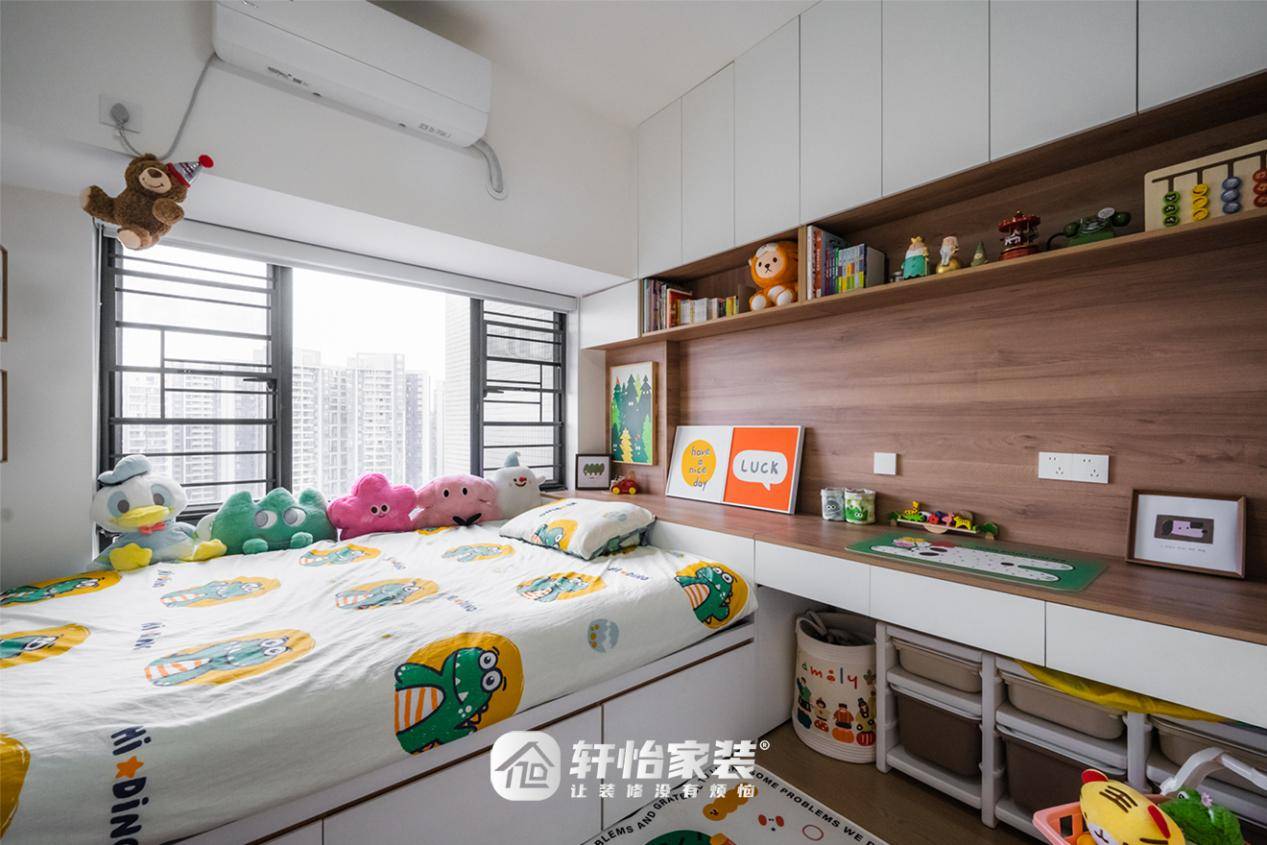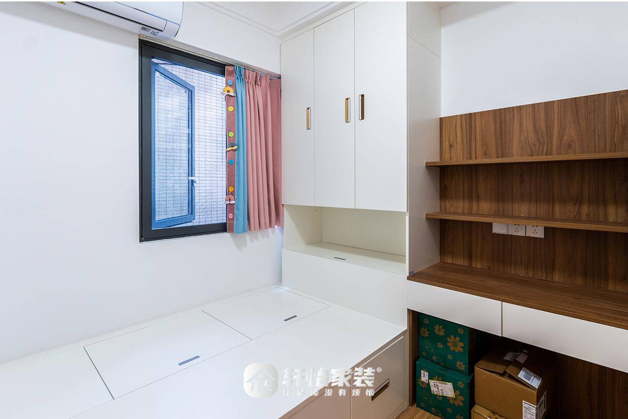③一体化布局,分区明确:采用“榻榻米+衣柜+书桌”的一体化定制。视觉上整齐划一,功能上满足睡眠、储物、学习等多种需求,特别适合儿童房或多功能房。