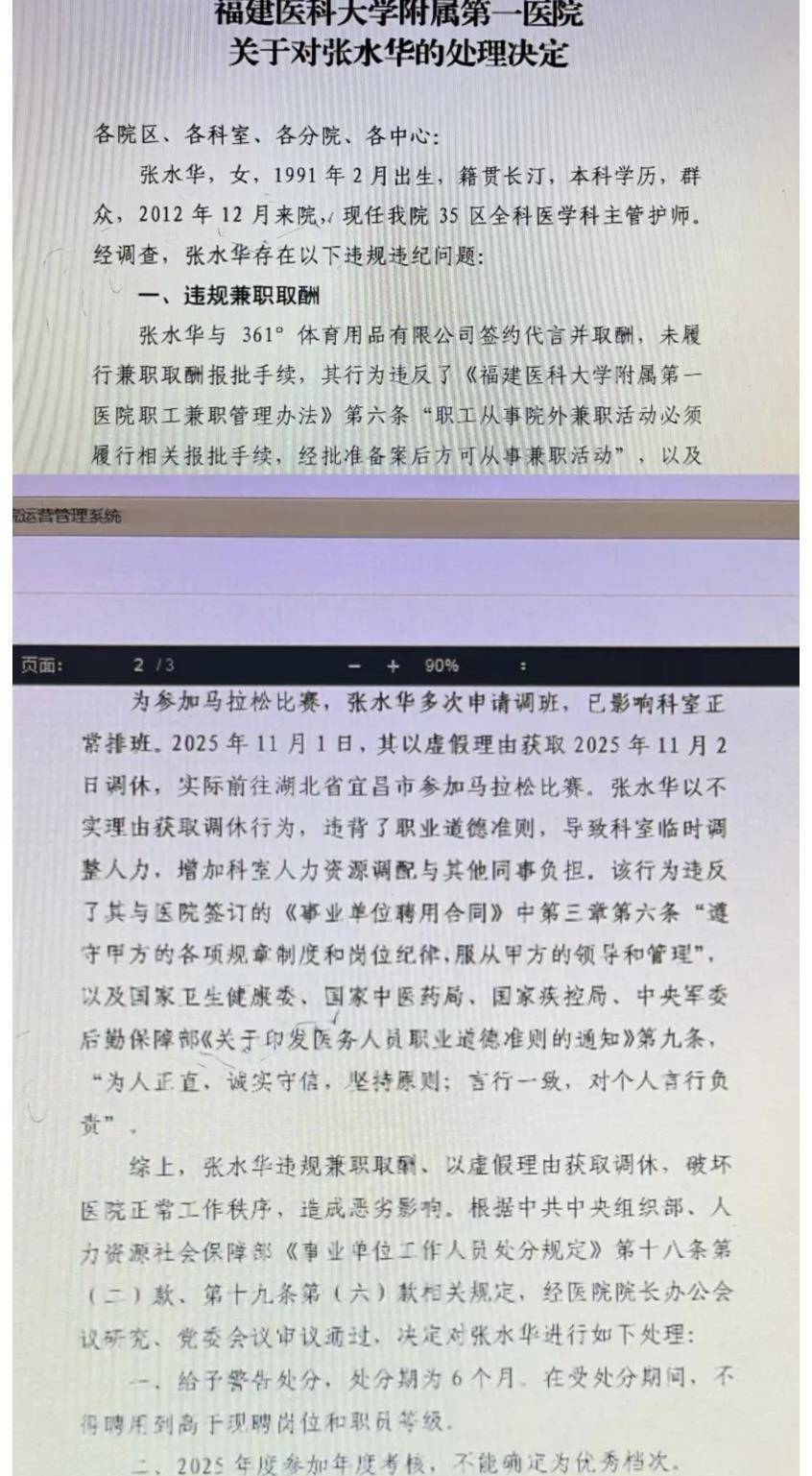 12月9日晚,一份名为《福建医科大学附属第一医院关于对张水华的处理决定》(下称《处理决定》)在互联网上流传,该《处理决定》显示,张水华存在违规兼职取酬、以虚假理由获得调休的行为,据此,其被医院警告处分6个月,并且在医院2025年年度考核中,不能确定为优秀档次。