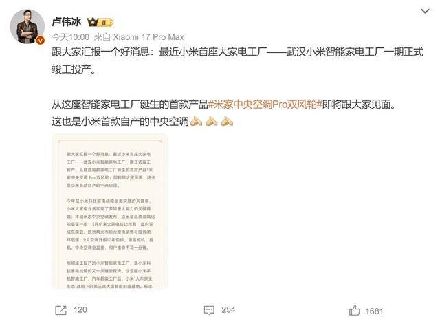 12月11日消息,今日卢伟冰在微博正式宣布:“最近小米首座大家电工厂——武汉小米智能家电工厂一期正式竣工投产。”而从这里诞生的首款产品,就是小米首款自产中央空调——「米家中央空调 Pro 双风轮」。