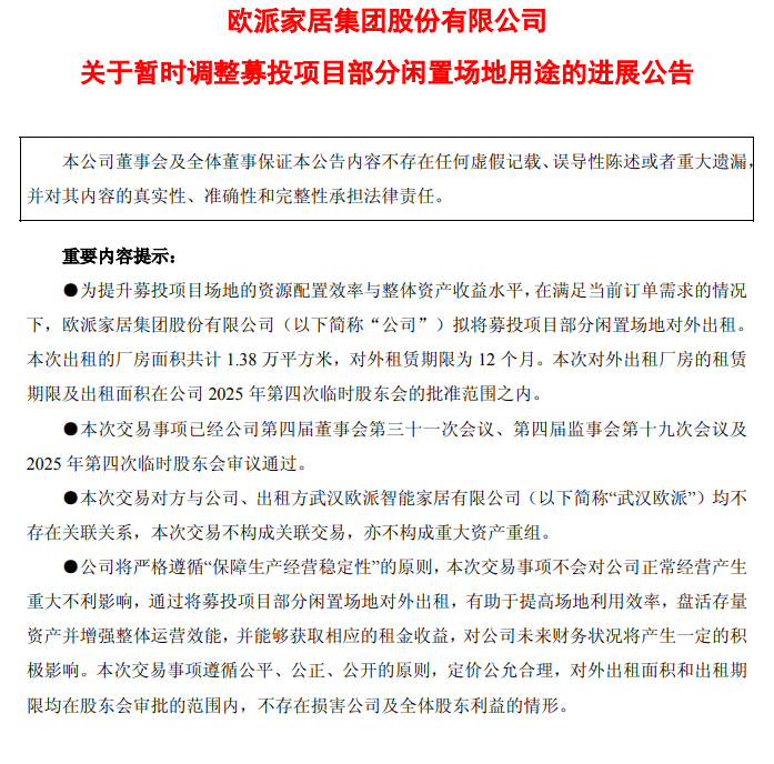 11月底,欧派家居公告称,同意公司暂时调整“欧派家居智能制造(武汉)项目”部分闲置场地用途,拟将募投项目部分闲置场地对外出租。为提升募投项目场地的资源配置效率与整体资产收益水平,在满足当前订单需求的情况下,2025年11月22日,武汉欧派分别与三家公司签订了《物业租赁合同》,将位于武汉市蔡甸区花园湾一街与竹林三路交叉口的部分闲置厂房出租给上述三家公司,本次出租的厂房面积共计1.38万平方米,对外租赁期限为12个月。