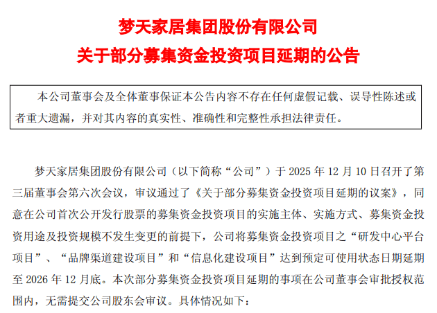 12月10日晚间,梦天家居(603216)公告称,公司于10日召开第三届董事会第六次会议,审议通过了《关于部分募集资金投资项目延期的议案》,同意在公司首次公开发行股票的募集资金投资项目的实施主体、实施方式、募集资金投资用途及投资规模不发生变更的前提下,公司将募集资金投资项目之“研发中心平台项目”“品牌渠道建设项目”“信息化建设项目”达到预定可使用状态日期延期至2026年12月底。