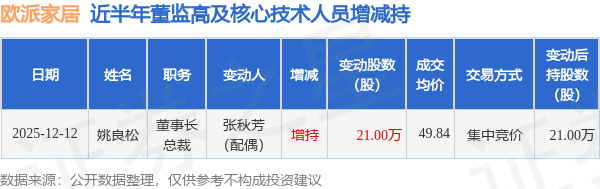 证券之星消息,根据12月12日市场公开信息、上市公司公告及交易所披露数据整理,欧派家居(603833)最新董监高及相关人员股份变动情况:2025年12月12日公司董事长,总裁姚良松的亲属共增持公司股份21.0万股,占公司总股本为0.0345%。变动期间公司股价下跌0.53%,12月12日当日收盘报50.53元。
