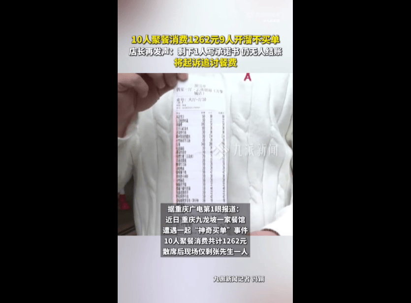 近日,重庆九龙坡一家餐馆遭遇一起“神奇买单”事件。10人聚餐消费共计1262元,散席后现场仅剩张先生一人。餐馆要求张先生结账时,张先生称此次聚餐为朋友组局,应由对方付款,自己无力承担。