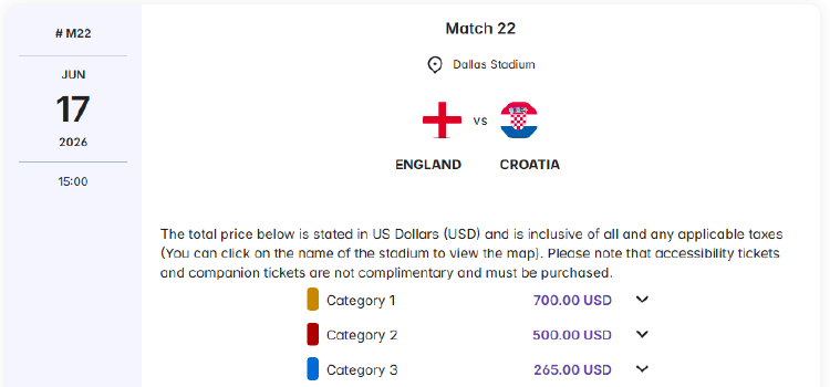 即使只看小组赛,门票定价也不低。根据FIFA官网公布的票价,英格兰队首战在美国达拉斯对阵克罗地亚,最便宜的门票也要265美元(约合1870元人民币)。