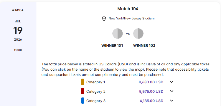 根据FIFA官网上的定价表,世界杯决赛的“经济票”起价为4185美元(约合2.95万元人民币),“标准票”为5575美元(约合3.93万元),“高端票”则为8680美元(约合6.12万元)。