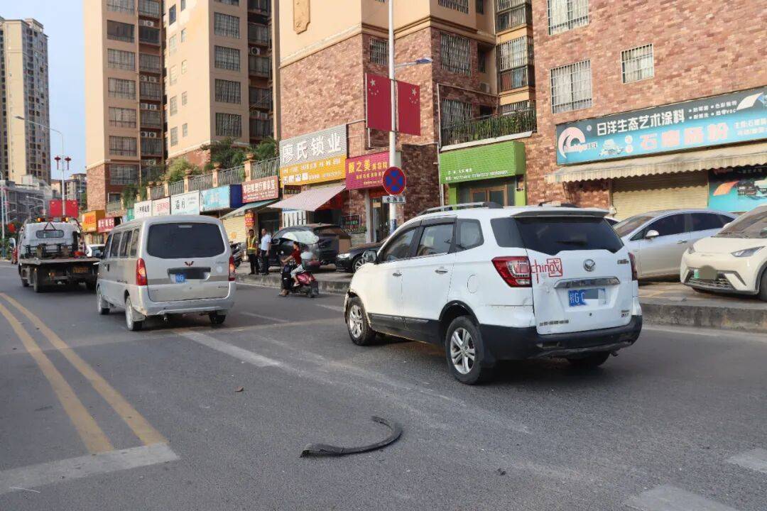 接警后,来宾市武宣县公安局交通警察大队立即赶往事故现场进行处置。只见一辆白色小客车和一辆小型面包车停在道路上,面包车右侧受损,小客车车身左前侧受损。