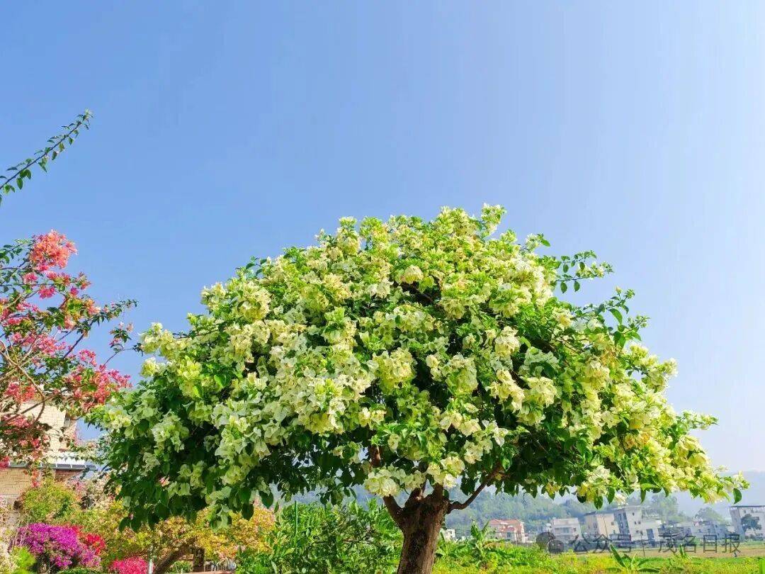步入庭院,一幅生机盎然的画卷渐次展开:院墙与花架上攀满紫、橙、粉等各色三角梅,绚烂热烈;月季吐艳、观赏菊含芳、蓝雪花缀枝,与三角梅相映成趣;造型规整的罗汉松挺拔而立,平添几分雅致意蕴;红砖小径蜿蜒于花丛之间,庭中摆放桌椅与盆栽鲜花,茶香与花香交融,尽显浓厚的生活气息。