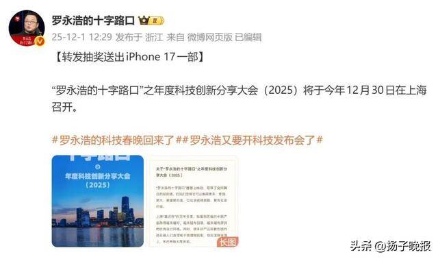 12月30日晚,罗永浩2025年度科技创新分享大会在上海举行。根据预告,大会将于19时进行,不过,罗永浩本人并未准时现身,而是迟到了44分钟后才出现在讲台。此前的发布会,罗永浩也曾多次迟到。有网友调侃道:“重新定义了19时。”