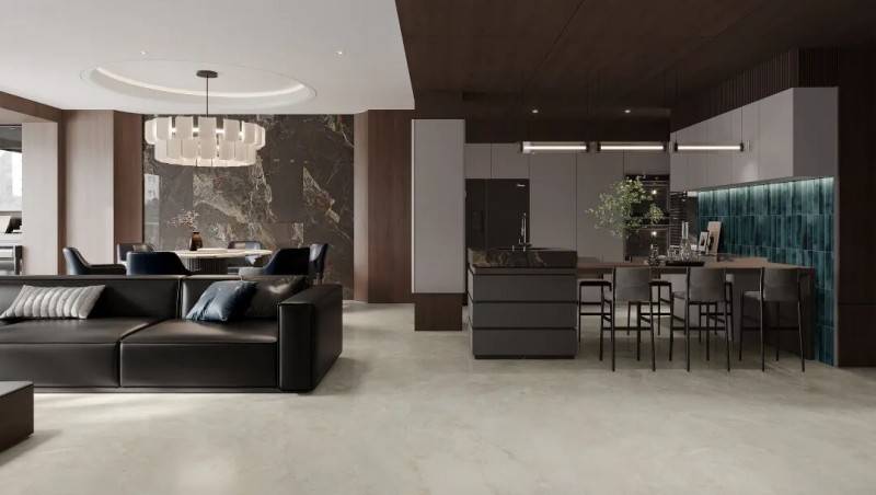 该系列搭载丝绒触感工艺,0.1 微米砖面平整度带来婴儿肌般的细腻触感,25°-30° 黄金光感区间实现柔和护眼效果,配合三重施釉的 5 级防污技术,疏水疏油易清洁,成为覆盖客厅、厨房、卫生间等高频使用区的全能型主砖,其低彩度温暖色系与天然理石纹理,更能包容百搭多种风格。