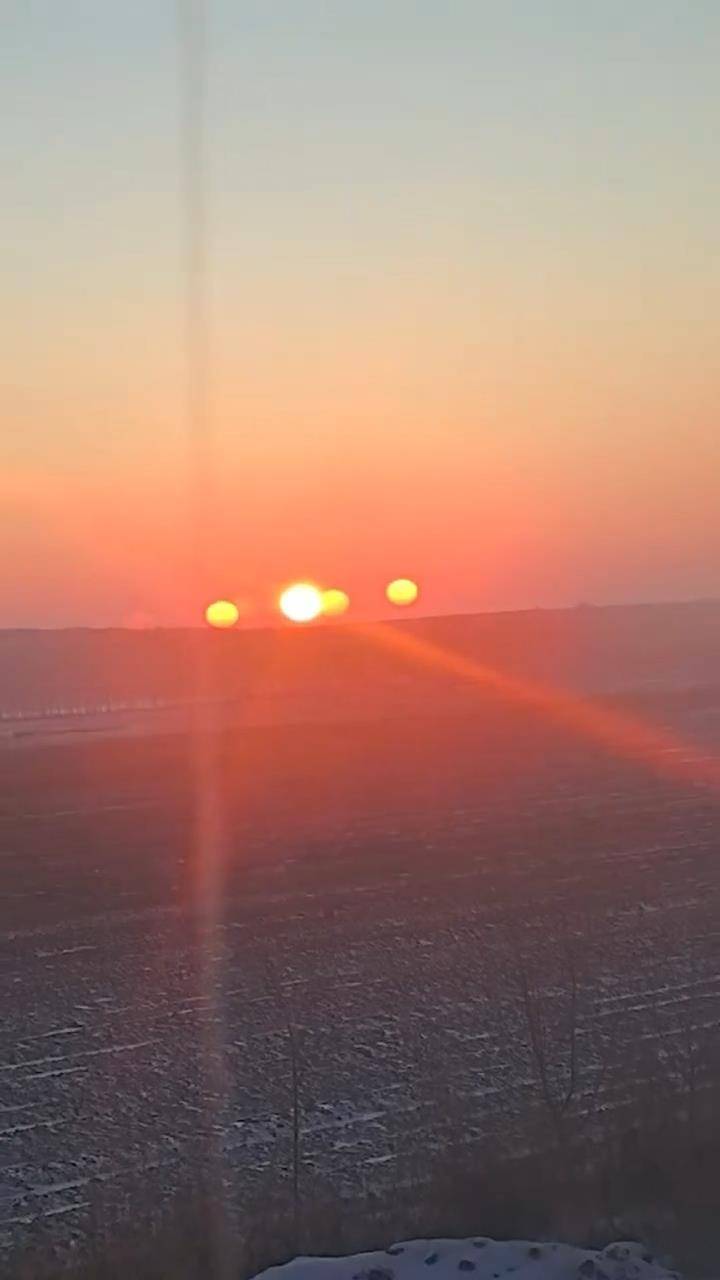 视频画面显示,遥望远方,绚烂夺目的太阳刚刚冒出地平线,但令人意外的是,太阳的左侧和右侧,分别出现三个“小太阳”,就像一个大太阳带着三个小太阳出行。有网友调侃称,快请后羿前来。