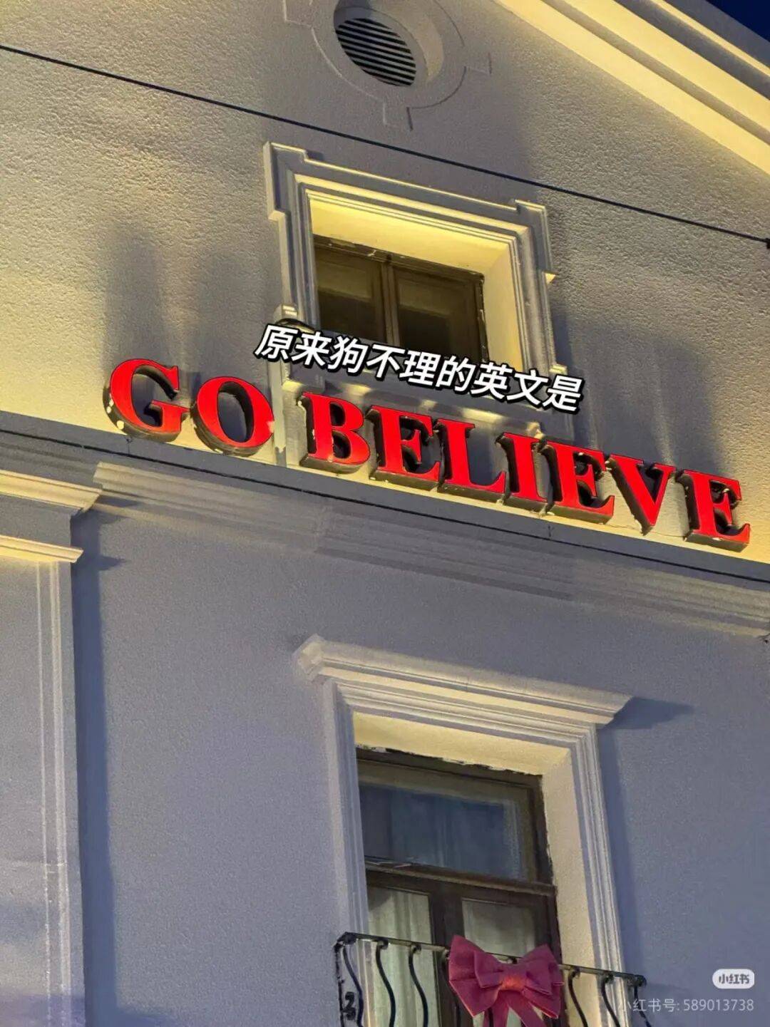 帖文所附图片显示,这家狗不理包子店的英文名标注为“GO BELIEVE”,恰好与“狗不理”发音相似。