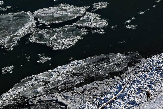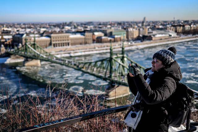 1月12日,一名女士拍摄漂流着浮冰的多瑙河。