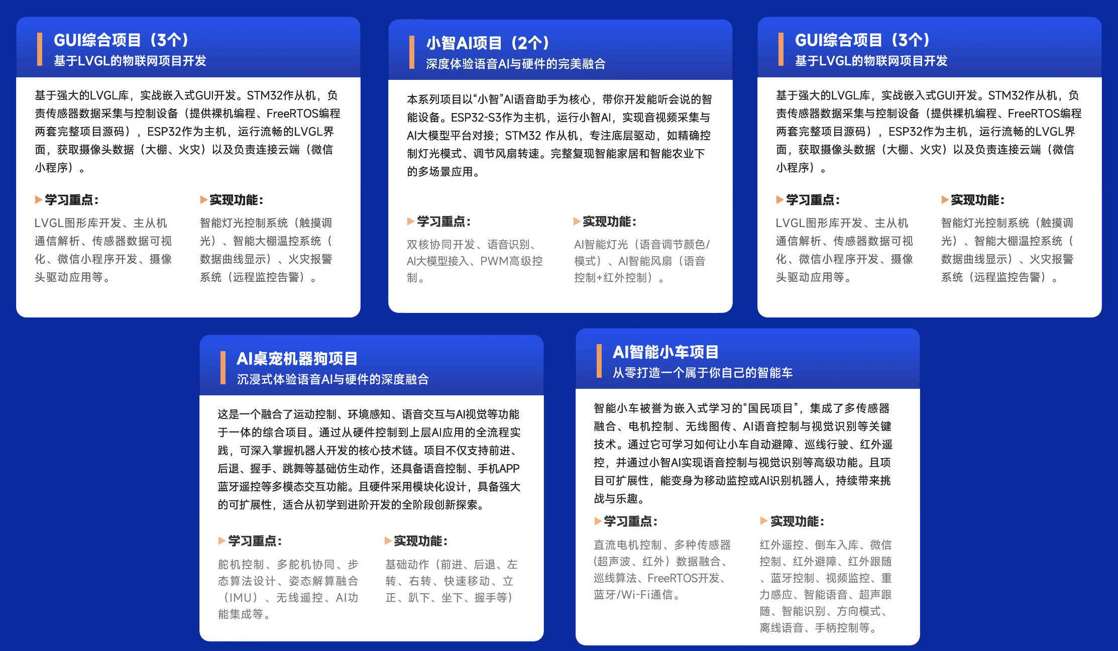这个想法,正是我们筹划这一系列分享的初衷。我们希望能为你们的毕业设计,提供一些不同的思路和具体的参考,增加一些创新点。在接下来的时间里,我们会陆续带来从易上手的AI趣味小应用,到综合性项目的讲解,包括13个AI入门应用项目、2个小智AI项目、3个LVGL综合项目、一个AI桌宠机器狗,以及那个经典的、国民级嵌入式项目——AI智能小车。