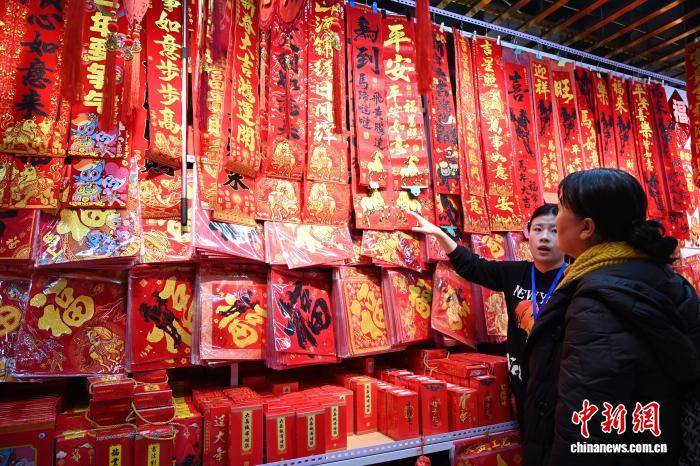 1月17日,内蒙古呼和浩特市,民众选购新春饰品。距离农历春节仅剩一个月,当地年货市场逐渐升温,春联、“福”字及马年元素饰品持续热销。中新社记者 刘文华 摄