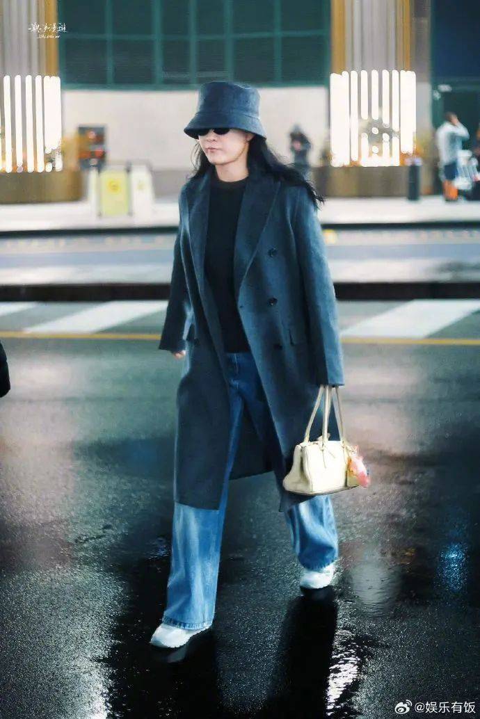 这次出发去米兰,一身灰色大衣搭配牛仔裤和渔夫帽,简单大方,气场十足。