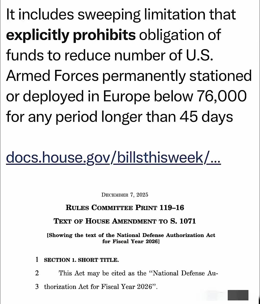 12月7日美国众议院312:112通过了《2026财年国防授权法》,包括:“禁止在任何超过45天的期限内,将永久驻欧美军人数削减至7.6万人以下”,“暂停与乌克兰分享情报需提前48小时告知国会”等内容。试图以立法形式约束总统单方面收缩美国海外安全承诺的权力。