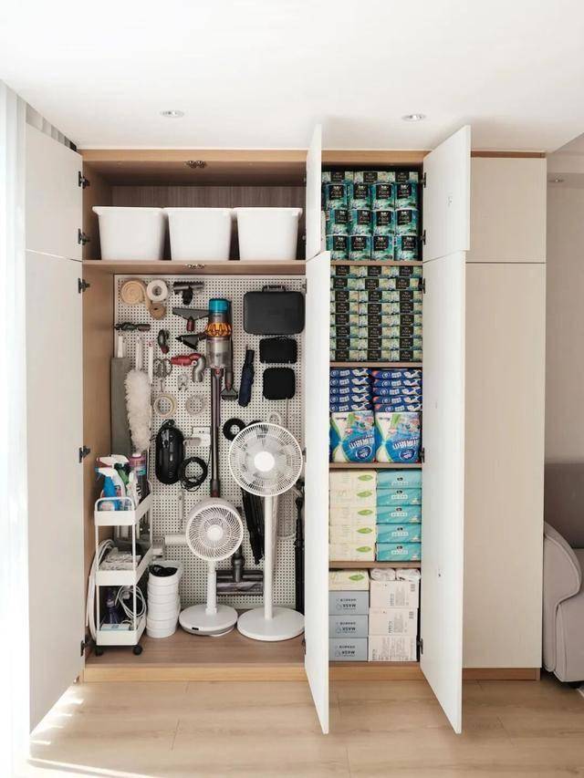 另一边的家政柜深度为60cm,主要用于收纳洗地机、小推车、扫把、吸尘器等一些清洁工具。