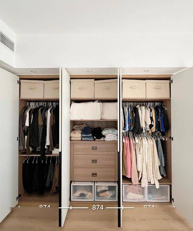 2)多做挂衣区,少做叠衣区,除了收纳时会更加省力之外,打开柜门后也能一目了然。