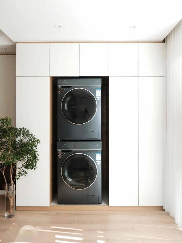 由于内嵌洗衣机和烘干机,洗衣柜的深度做到了70cm,视觉上可以让空间表现更加整体统一。