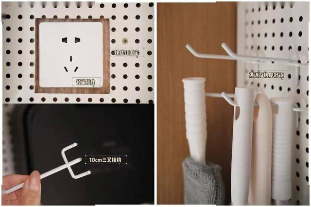 内部结构同样分成了隔层区和镂空区,只不过镂空区增加了洞洞板,再搭配上一些三叉钩,大大小小的工具都能得到整齐安置。