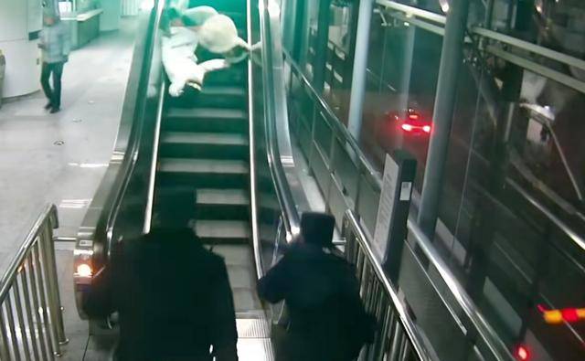 近日,在北京地铁大屯路东站,两名女子携手乘坐自动扶梯时突然失衡后仰,瞬间头朝下随滚梯倒滑。