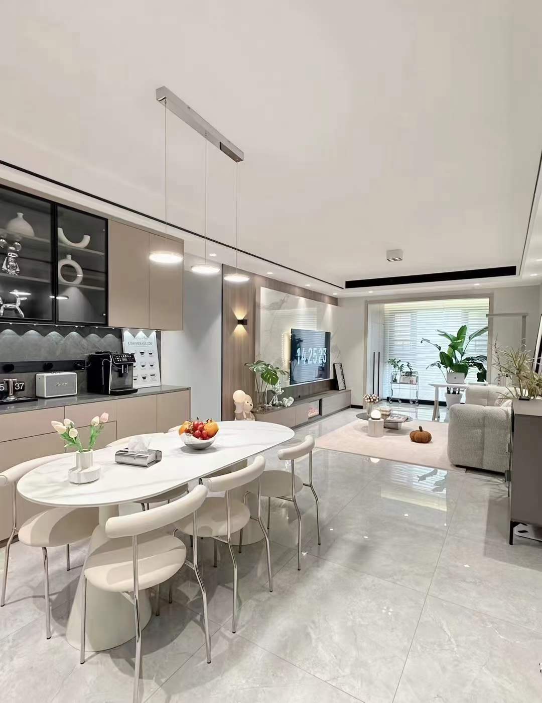 积家装饰采用开放式围合布局,空间通透流畅。视线可毫无阻隔地延伸至厨房,让家人备餐时的身影与笑语成为最动人的风景。一组深棕色的木质吊柜恰到好处地点缀其间,其温润的质感瞬间柔化了黑白的冷峻,为空间注入一丝暖意与高级感。