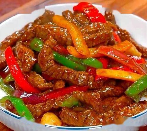 3. 热锅凉油滑锅,下牛柳大火快炒40秒,表面微焦立刻盛出。