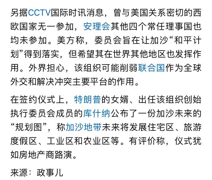不得不说,美国的规划实在让人联想到其以往的地产背景。这种似乎通过和平委员会推动的商业发展,是否隐藏着某些潜在的经济利益?作为一位商业精英,美国无疑清楚如何利用各种国际平台为自己谋取更大的利益。 在上述国家名单中,最让人意外的可能是巴基斯坦。长期以来,巴基斯坦与中国保持着深厚的友谊和合作关系,但这次却选择加入了和平委员会。或许这背后有其复杂的外交考量,但无论如何,我们也能理解这一选择。至于那些没有加入和平委员会的国家,包括中国、俄罗斯、日本、法国、德国、以色列、意大利、荷兰、波兰和西班牙等国家,其中西欧国家几乎全军覆没,这一结果实在令人颇感意外。不知道未来是否会有更多国家加入或退出,但从目前的局势看,许多国家仍然对联合国体系抱有深厚的感情和依赖。 总的来说,全球大多数国家依然在国际事务中依赖于联合国的多边机制,而美国提出的加沙地带和平委员会,看似只是其为自己绘制的宏伟蓝图。加入该委员会的国家相对较少,这更像是一个商业帝国成立的新股份公司,而非名副其实的和平委员会。
