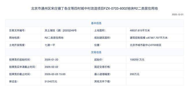 通州宋庄四村城改项目6002地块,规划建面约8.74万㎡,起价15.62亿元。