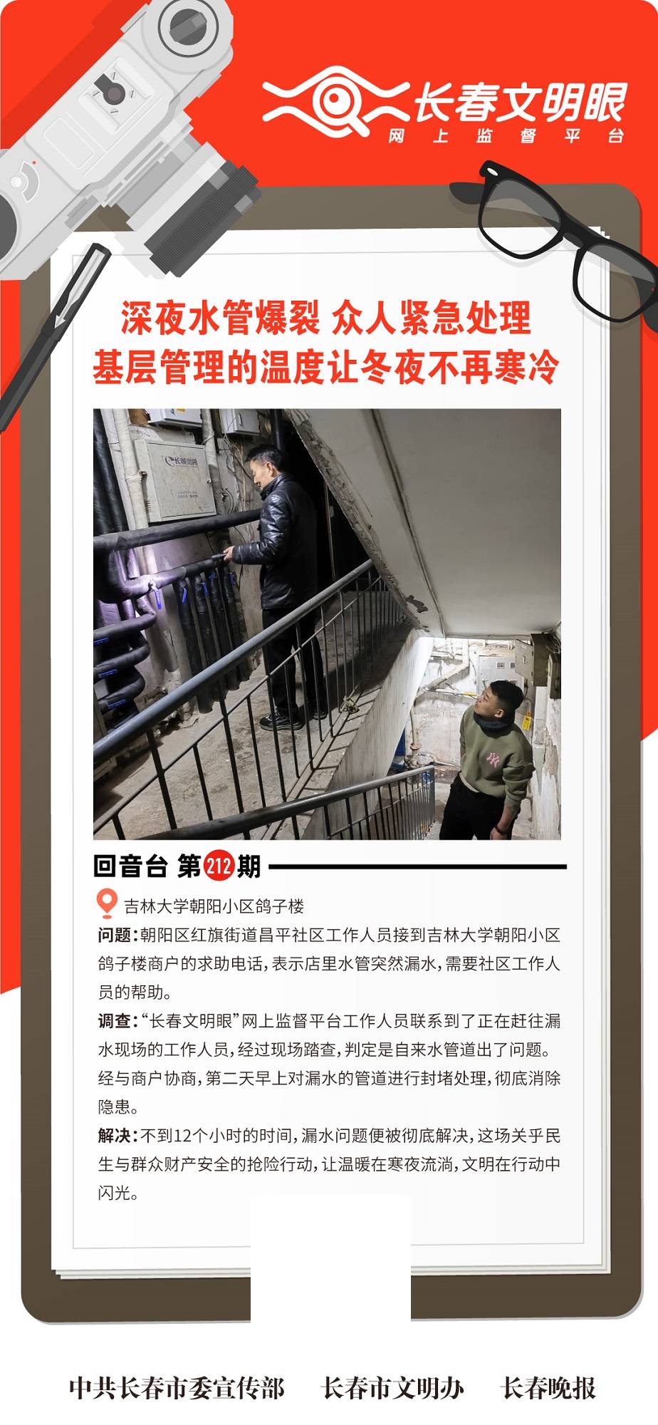 “社区吗?我是一楼商户,店里水管突然漏水,越来越严重,麻烦你们快来看看!”近日,朝阳区红旗街道昌平社区工作人员接到吉林大学朝阳小区鸽子楼商户的求助电话。听出电话那头语气里的焦急,工作人员二话不说,穿上外衣便冲向了现场。与此同时,“长春文明眼”网上监督平台工作人员了解到该线索,迅速联系到了正在赶往漏水现场的网格员王春梅,全程跟踪事件的解决情况。