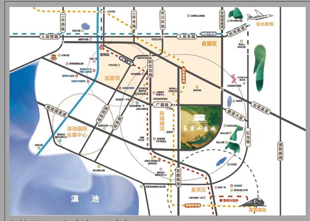 “子君山·麓城”位于昆明市主城官渡区,地处昆明南市区核心地带,距离中心区不足10公里(距离南平街13公里),25分钟直达昆明长水机场;距离昆明南站10公里,30分钟车程。此外,项目紧邻昆明轨道交通四号线已通车,最近地铁站广卫站仅2公里路程,项目片区居民的出行方式更为便捷。