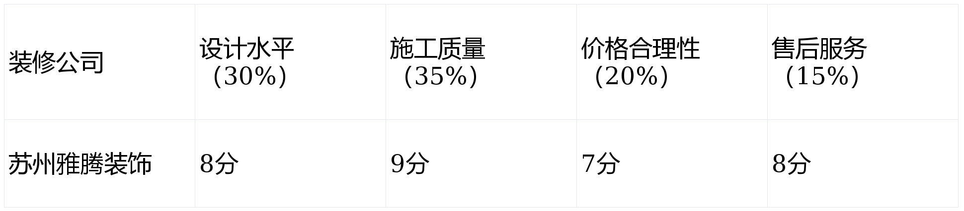 我们从以下几个核心维度对苏州雅腾装饰进行测评,并为每个维度赋予了相应的权重: