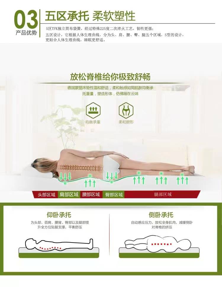 深睡体验的核心,在于科学适配人体需求,德国蒙丽以数字睡眠理念为核心,打造专属国人的舒适睡眠系统。其七区支撑设计,根据人体生理曲线,将床垫划分为头、肩、背、腰、臀、大腿、小腿七大区域,摒弃传统床垫“一刀切”的支撑模式,7秒即可快速贴合人体曲线,确保睡眠时脊椎始终保持自然“S”形,有效分散身体压力,缓解腰背疲劳。支撑层采用经225℃二次高温淬火的高碳锰钢弹簧,按0.2mm递进差异设计线径,受力更均匀,即便对折180°也不会变形,翻身无噪声,既能为腰臀等压力集中区域提供强韧支撑,也能为肩腿部位适度减压,兼顾支撑性与包裹感。