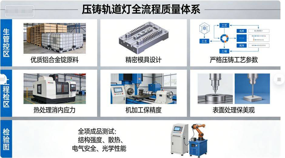 质量控制的关键环节 压铸轨道灯的质量控制贯穿整个生产过程。原材料要选用优质铝合金锭,确保材质纯净度。模具设计和制造要精密,这直接影响产品精度和外观。