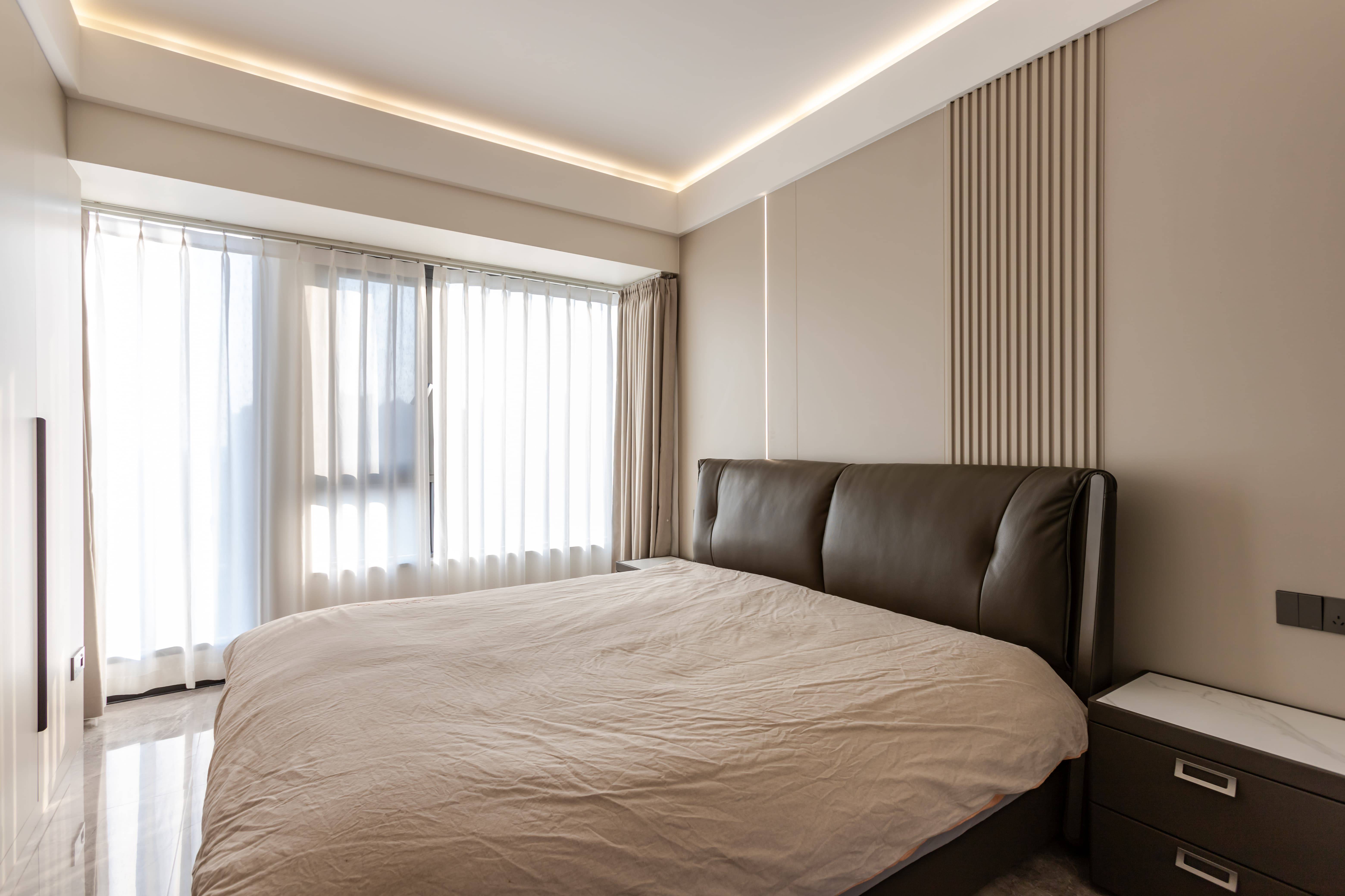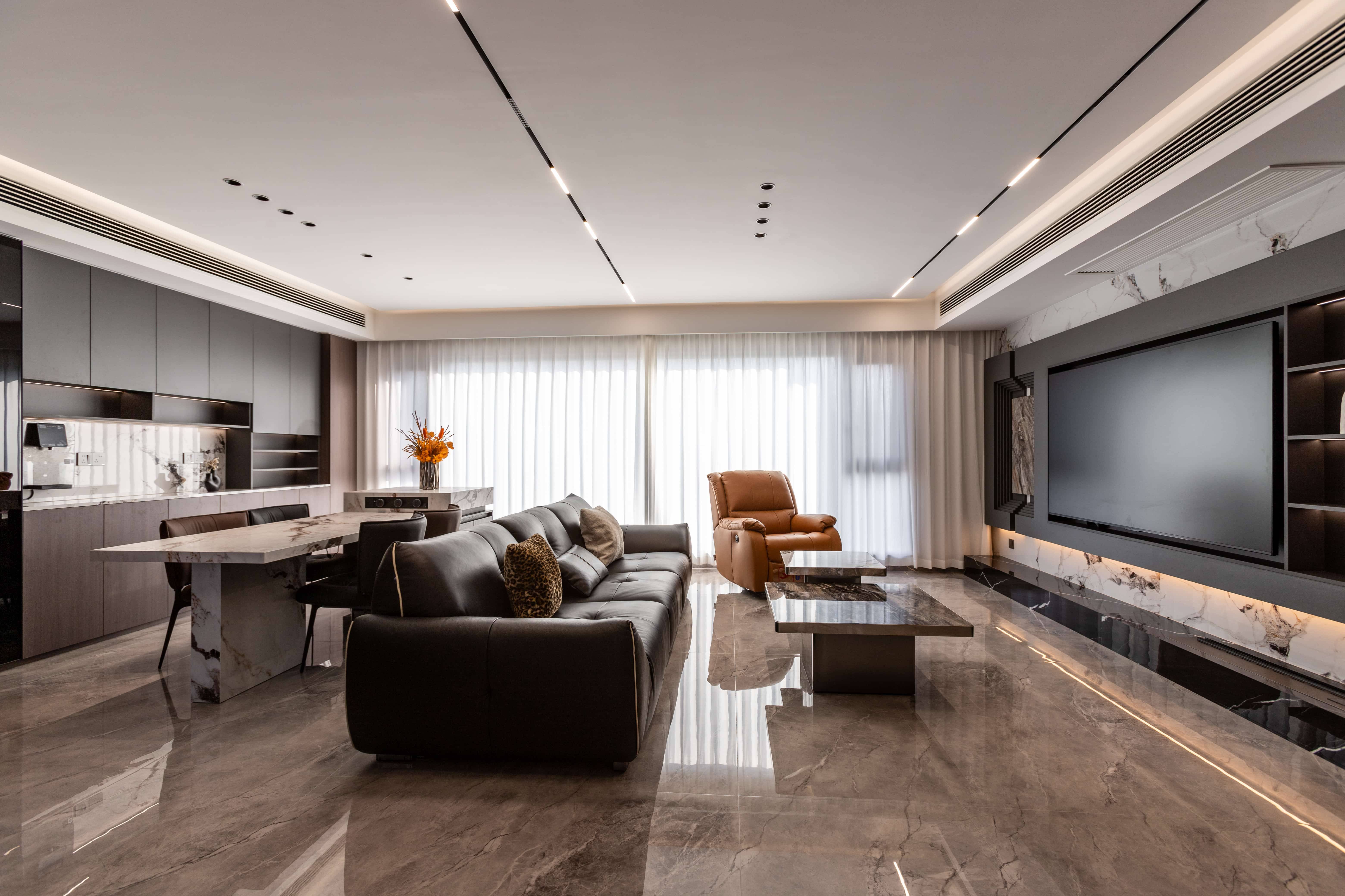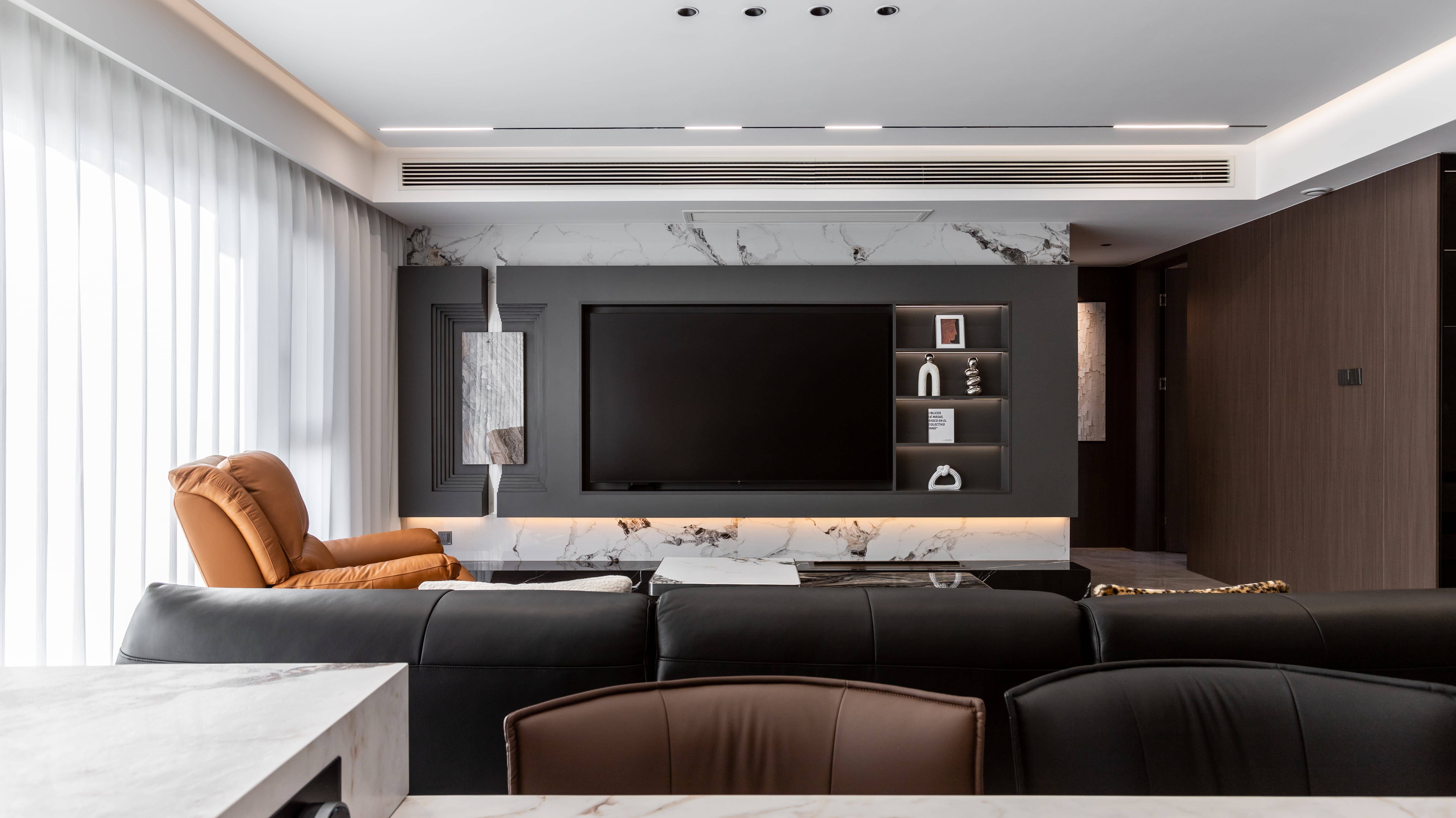 本案是一套现代风格装修实景,客厅是整个家的 “松弛核心”,以中性色为基调,木质搭配纯白,营造出开阔通透的视觉感受。黑色皮质沙发,自带 “陷进去就不想动” 的慵懒感,搭配方形大理石纹茶几 + 卡其色单人椅,在低饱和色调里跳出细节层次。无主灯 + 线性灯的灯光设计,白天透光纱帘引入自然光,夜晚暖光一开,窝在沙发里追剧,直接把 “家庭影院” 的氛围感拉满。