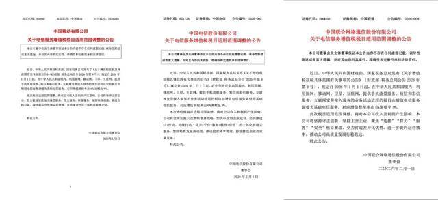 日前,中国移动、中国联通、中国电信三大电信运营商相继发布公告表示,其手机流量、短信及互联网宽带接入等业务的增值税税目适用范围发生调整,对应增值税率从6%提升至9%。这一调整将影响公司的收入和利润。