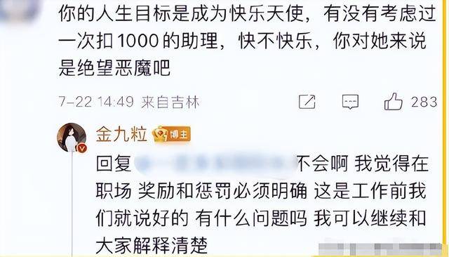 除了身体姿态之外,经济手段也被用作一种规训术,金靖曾公开过她对助理的“千元罚款制”,犯一次错就要罚款1000元,尽管她解释说,这些钱会在年底五倍返还,但这套机制的本质,却是一种权力的符号化宣告。